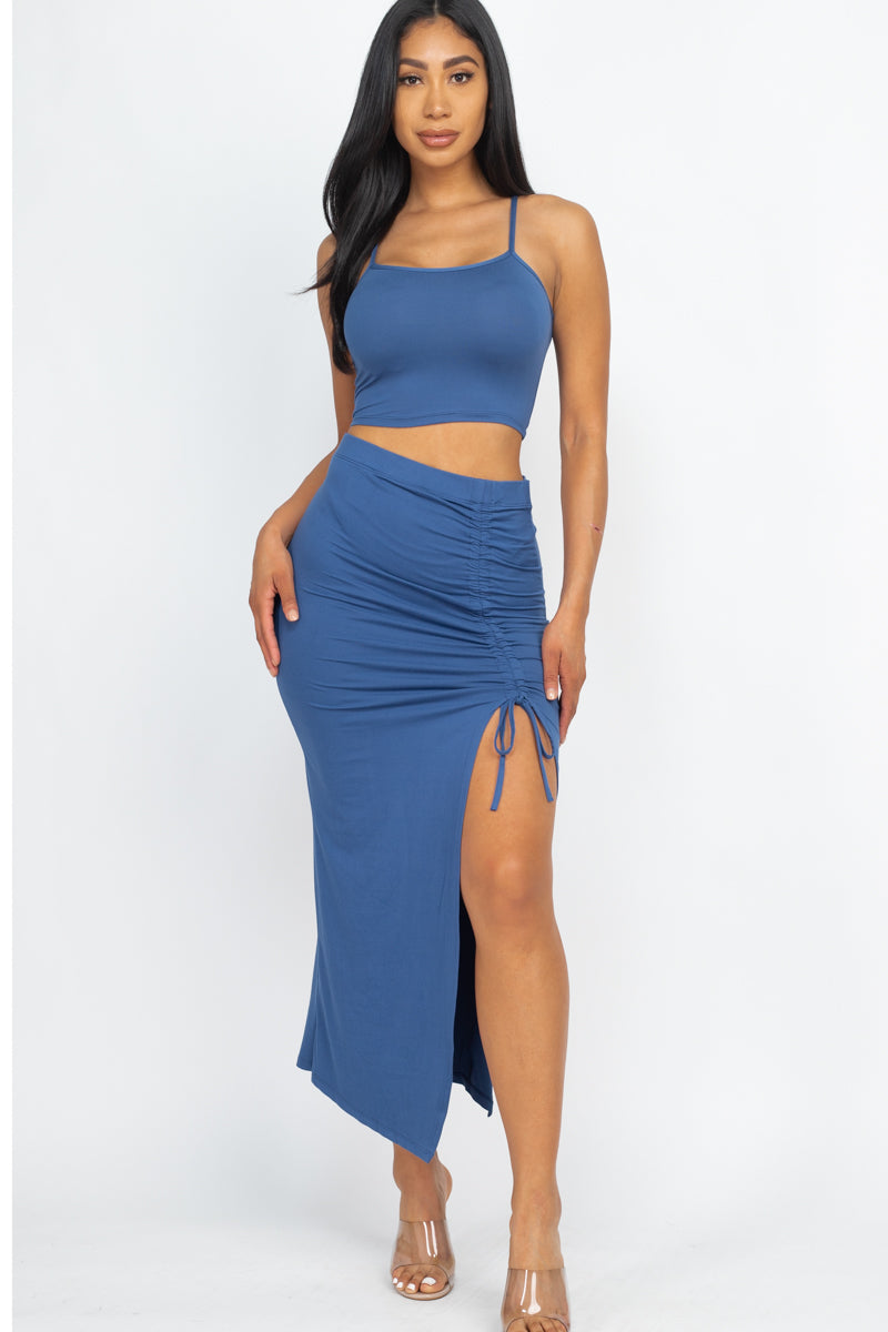 Cami Crop Top & Ruched Side Split Hem Midi Skirt Set - Wholesale Capella Apparel