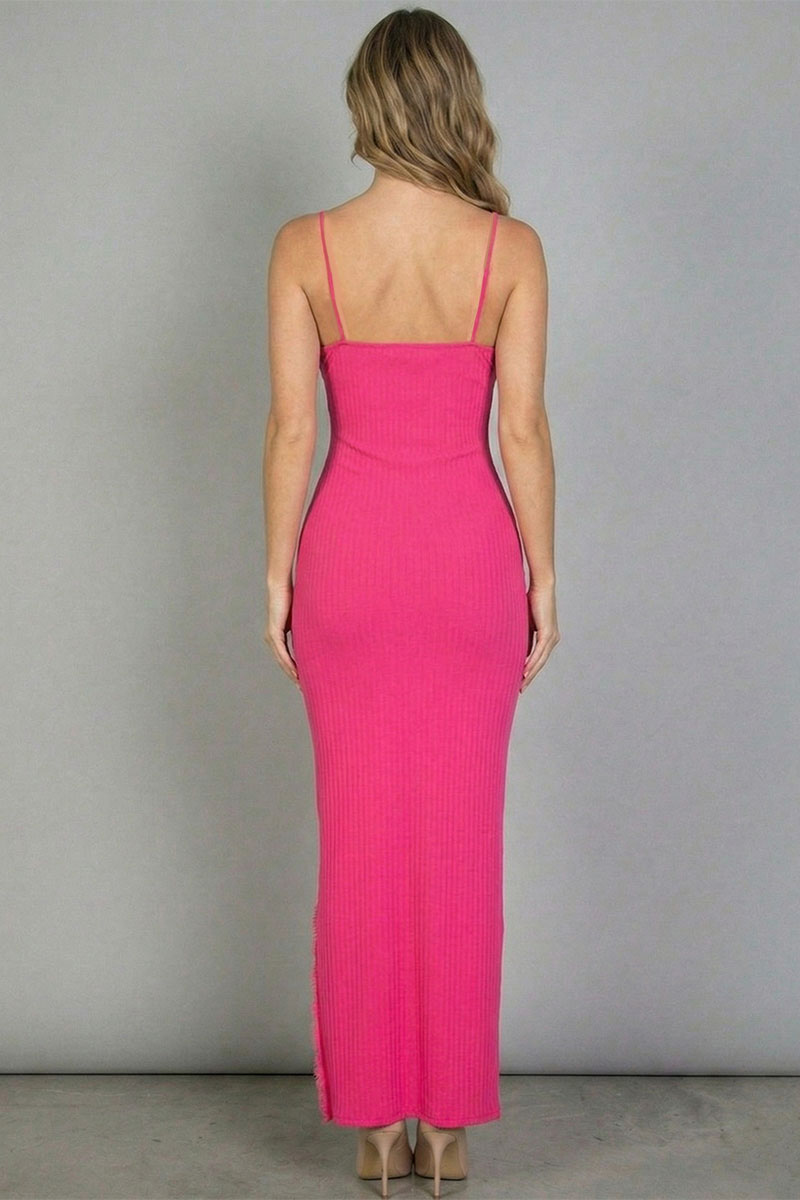 Turn heads in this stunning cami dress featuring delicate eyelash lace trim and a sultry thigh-high slit. The body-hugging ribbed fabric enhances your curves, while the deep V-neckline adds an alluring touch. Perfect for date nights, special occasions, or an elevated night-out look.