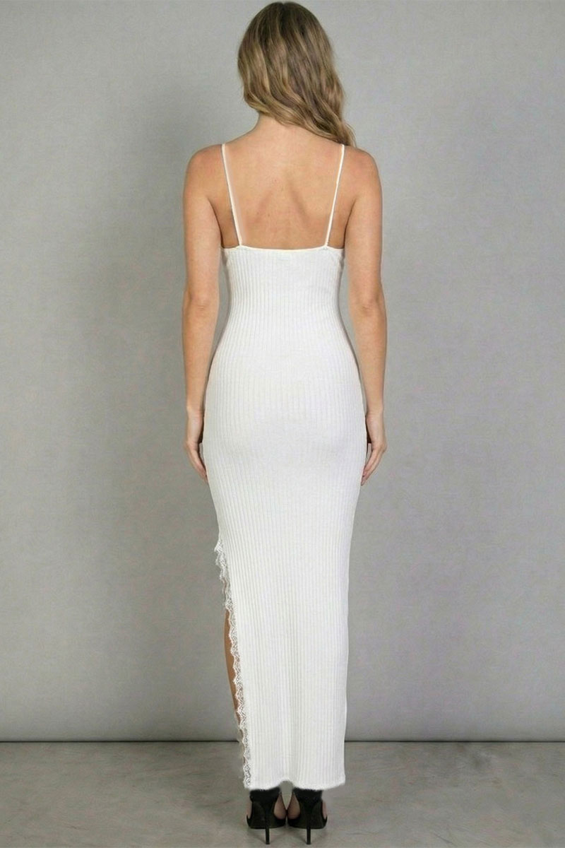 cami dress, lace trim dress, split thigh dress, elegant evening dress, ribbed bodycon dress, sultry night-out look, feminine chic outfit, statement fashion