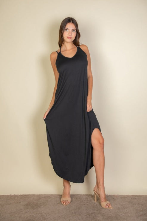 Effortlessly chic and endlessly comfortable, this solid cami dress is the ultimate go-to for a relaxed yet stylish look. Designed with double straps for a unique touch, this flowy silhouette drapes beautifully for an easygoing yet flattering fit. Featuring a soft, breathable fabric, side slits for extra movement, and a halter tie-back detail, this dress blends casual charm with understated elegance.