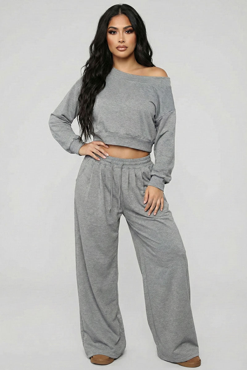french terry set, matching lounge set, off shoulder sweatshirt, wide leg sweatpants, co-ord set, charcoal grey outfit, athleisure, street style, crop top and pants set, cozy loungewear